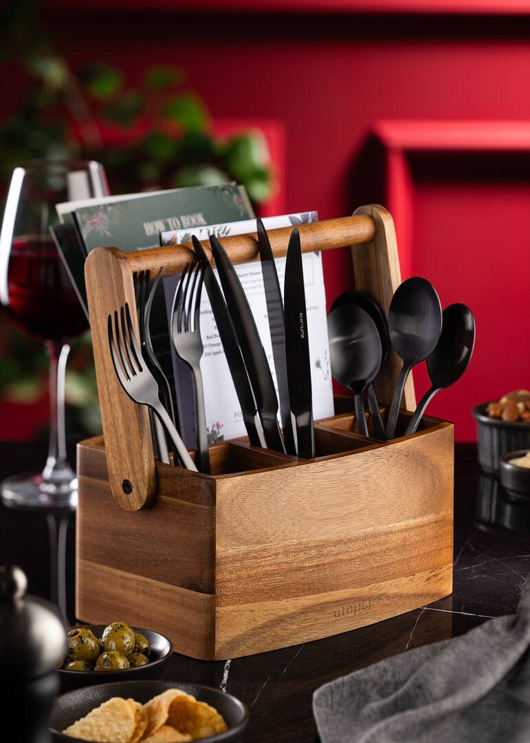 These beautifully crafted acacia wood table caddies are the perfect addition to the well-dressed table. Created from sustainable source they are an ideal way to present a range of tabletop items including condiments, cutlery and menus