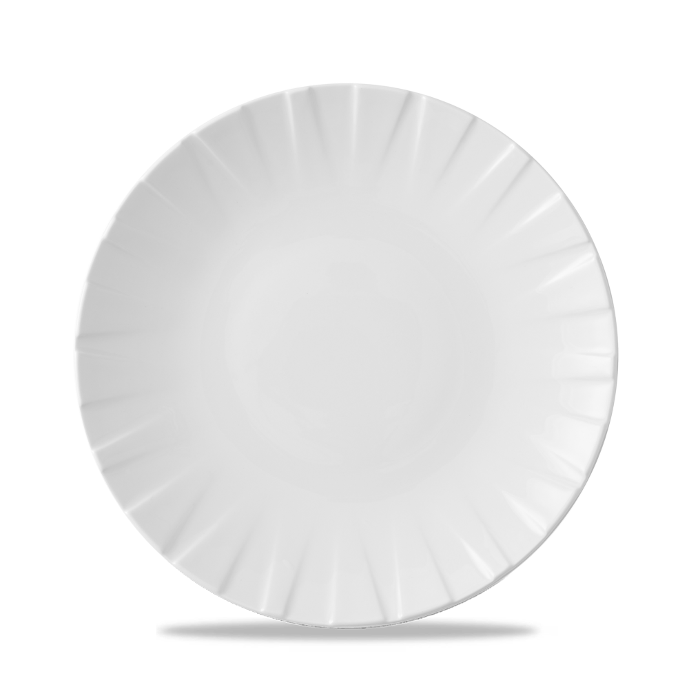 The Alchemy Abstract White Coupe Plate 9" is designed for contemporary dining settings, featuring a fresh geometrical embossment on pure white vitrified fine china. This high-performing and functional collection is enhanced by added alumina, which improves both strength and whiteness.
