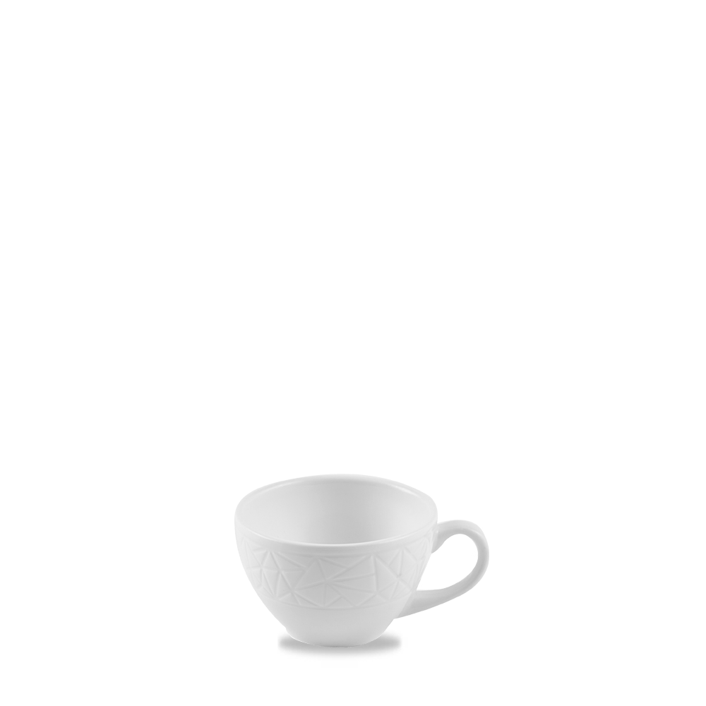 The Alchemy Abstract White Cup 3oz is the perfect addition to contemporary dining settings, showcasing a sleek geometrical embossment on pure white vitrified fine china.