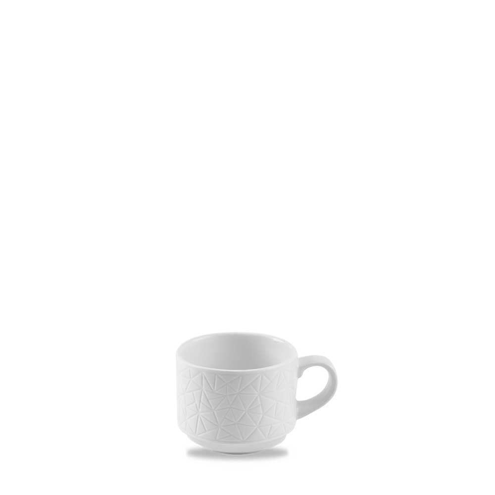 Introducing the Alchemy Abstract White Cup 3oz, a stunning addition to your contemporary dining experience. Crafted from pure white vitrified fine china, this cup combines modern design with high functionality. Its fresh geometrical embossment not only elevates the aesthetics but also provides added strength and durability, thanks to the alumina-enhanced fine china body.