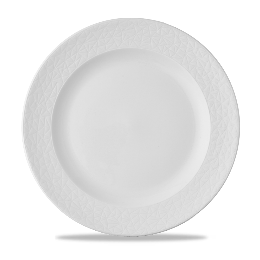 The Alchemy Abstract White Plate 10.5/8" is designed for contemporary dining settings, showcasing a fresh geometrical embossment on pristine white vitrified fine china. This high-performing and functional collection is made with enhanced alumina, ensuring exceptional strength and brilliance.
