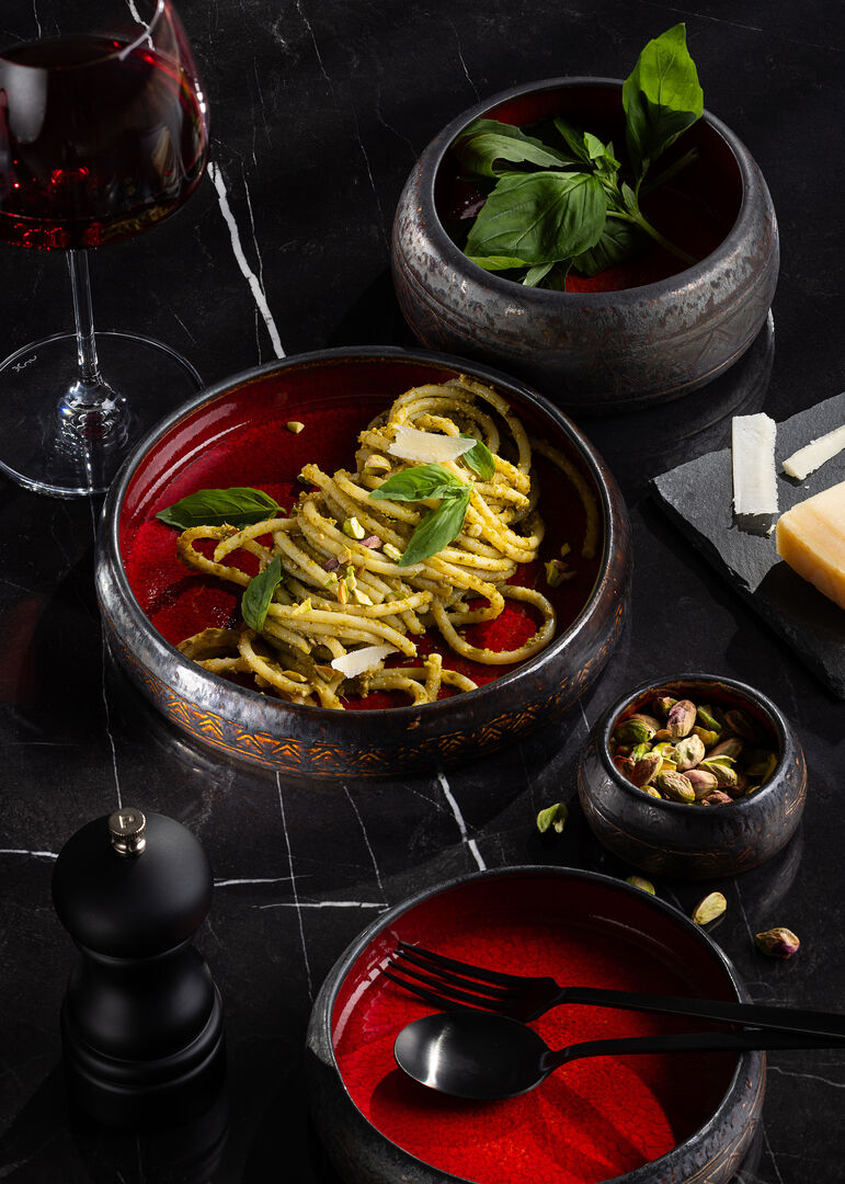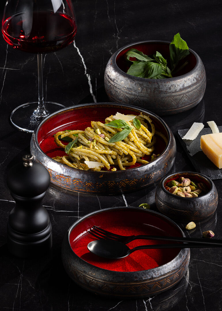 Carthago is available with two stunning interior finishes, a jewel-like deep red and a richly toned stone, each is encased within a dark exterior. The pieces are further enhanced with hints of metallic colour a subtly embossed geometric pattern. The combination of reactive glazes and hand finishing makes each item unique.