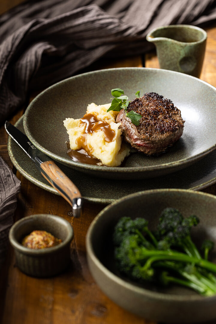 The dappled reactive glaze of the Granite collection is available in two colourways a natural olive green and a deeply rich Granite Blue.