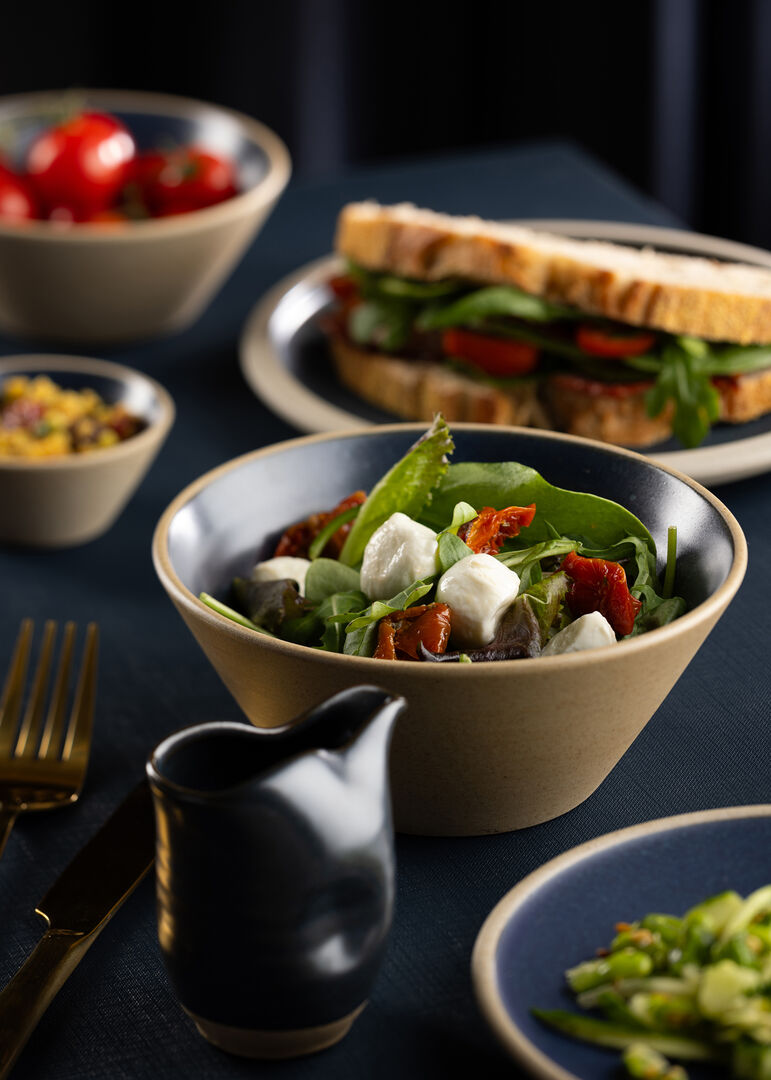 Footed bowls and a rich blue colourway combine with a low sheen glaze to give the Vitrified Porcelain Ink collection a feeling of casual sophistication