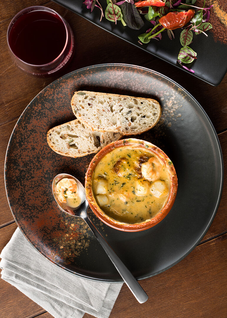 Oxy is a broad collection with oriental overtones. Based upon a dark satin glaze each piece is enhanced with hand decorated fiery tones adding drama to the serve.