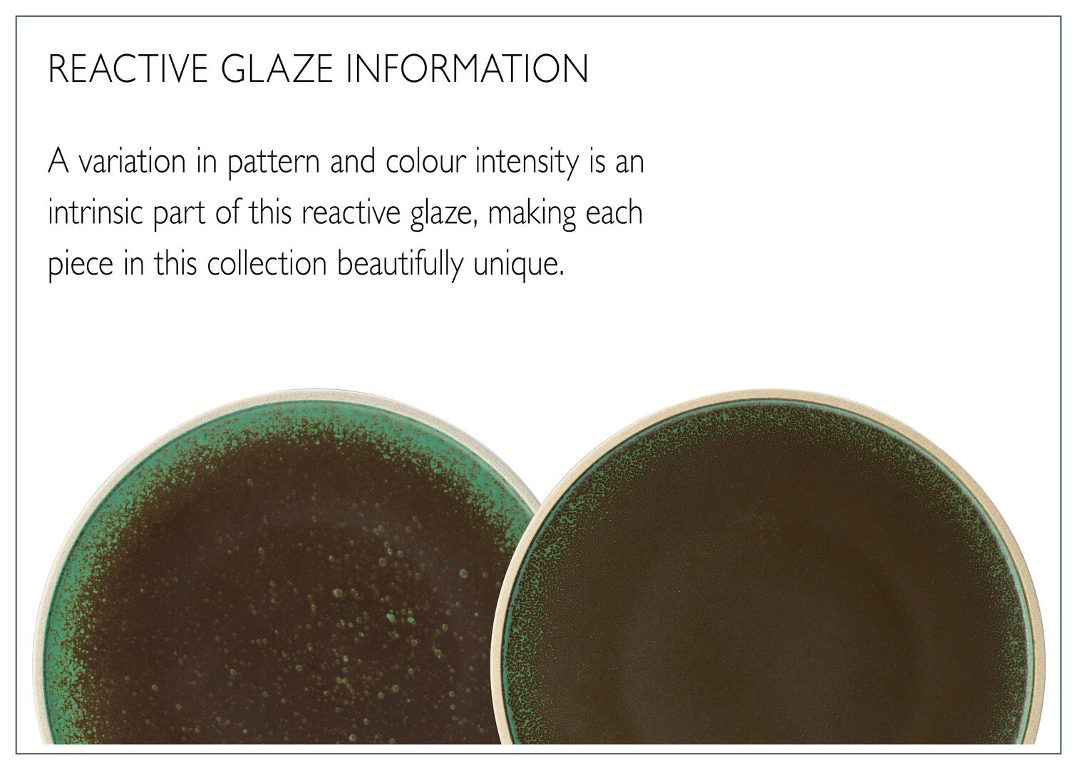 The reactive glaze creates a halo of vibrant green encircling rich earthy tones and creating unique surfaces across this Vitrified Porcelain collection