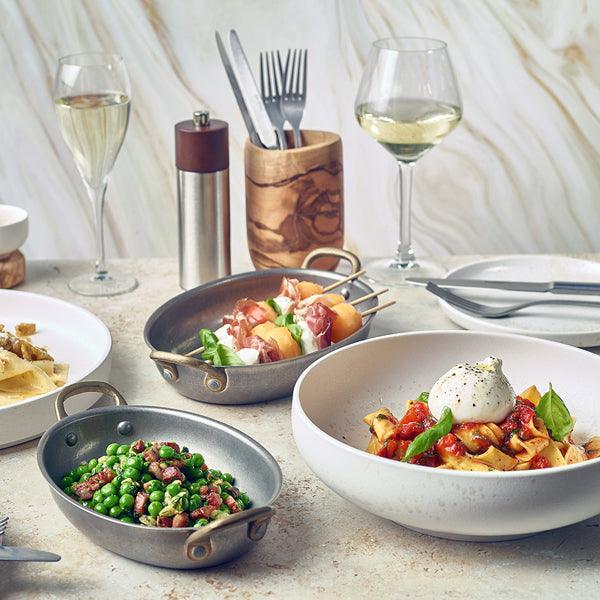 The Sereno Porcelain Alto Coupe Bowl 18.5cm features a stunning cloud-inspired design that reflects the serene beauty of high-altitude skies. This bowl combines a textured matte white glaze with a hand-finished accent glaze, ensuring each piece is unique. Ideal for elevating any table setting, it blends contemporary aesthetics with practical functionality. The bowl is dishwasher, oven, freezer, and microwave safe, making it versatile for everyday use or special occasions.