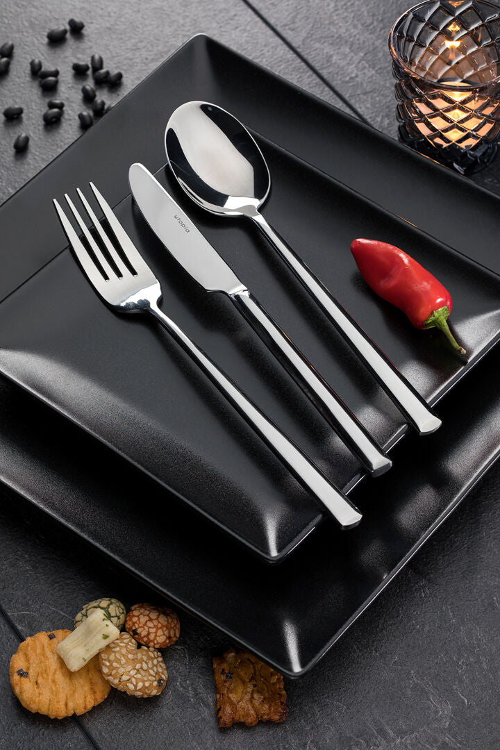 A slim contemporary design, the clean lines of signature along with the elongated handles make it the perfect companion to larger tableware pieces.