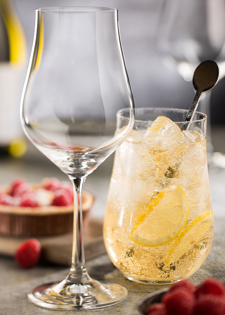 The crystal Tulipa collection is available in two stunning options, one clear one optic. This clear version features beautiful curvaceous bowls and elegant stems. Generous capacities and matching tumblers make this a versatile suite.