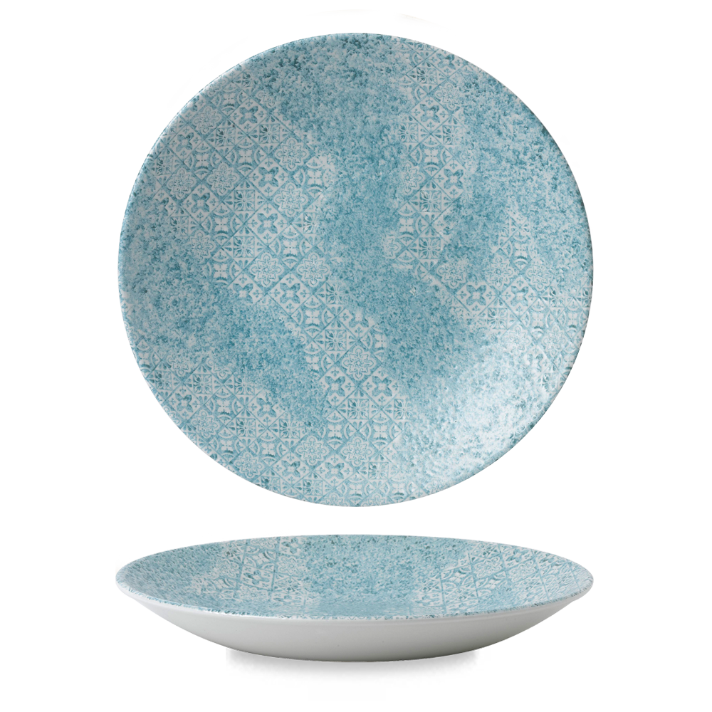 Introducing the Vintage Prints Aquamarine Med Tiles Deep Coupe Plate 11". This stunning plate showcases a design inspired by the timeless Moorish tiles found in Mediterranean cities, particularly Spain, Portugal, and North Africa. Each piece reflects a unique character with a worn and aged appearance, thanks to Churchill's innovative print process that ensures no two plates are exactly alike.